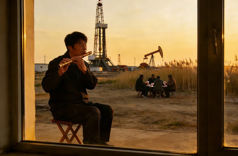 那时候每当完井,我们就要像候鸟般忙着迁徙,工作紧张忙碌。井场如同孤岛,散落在农田与村庄之间。白天,钻机轰鸣,钻头与岩层的较量惊心动魄;夜幕降临,井场四周的旷野漆黑一片,唯有月光洒井场,在钻杆上反射着微微的冷光。钻井工作是艰苦的,业余生活也是平淡而枯燥的。老书记调来后,傍晚时分总爱在宿舍窗前摆一张小凳。暮色降临时,他掏出一支竹笛,指尖一动,悠长的笛声便漫过整个井场。那笛声清越如风掠过苇荡,苍凉似秋夜的霜,让队里打牌的喧闹声渐渐低了下去。起初大家还觉得新鲜,后来竟被这缕音律牵引着——有人说要学吉他,有人想拉二胡。老书记在学校时就是文艺委员,吹拉弹唱样样拿得出手,他就成了他们的“义务老师”。他认真给他们讲解一些简单的乐理知识。给平静枯燥的一线生活带来了亮色。那年在邮1井施工的时候,生活条件格外艰苦,大家住在船上,井场四周筑起了一道防浪墙,下班后只能听到湖水拍打船体的声音。由于在湖区,就连散步也只能在湖滩上走走,驻地被防浪墙围成孤岛。那日,我从高邮城买来一支竹箫,试着在船头吹奏,却总也吹不出曲调。老书记走过来,接过箫管,一曲《阳关三叠》竟如流水般淌出。箫声穿透夜色,裹着湖面的雾气,将人带回千年古道,又仿佛看见大漠孤烟。他吹完一曲又一曲,直到深夜大家才恋恋不舍地散去。