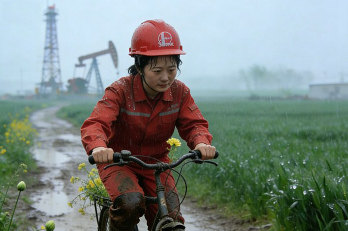 三月的雨是美丽的,田野里,在雨中返青的麦苗长出了嫩绿的新叶,雨水挂在叶子上,如露珠般晶莹剔透,油菜花点缀在田间,但是大多数还是含苞待放,只等几场雨后,那金黄的花朵轰轰烈烈地铺展开来,来一场春天盛大的约会。绵绵的雨也给生产带来了不便,巡井的女工骑着车,艰难地行进在泥泞的路上,工裤膝盖处的油污被雨水浸成深褐色,远处的井架和抽油机的剪影在雨中若隐若现,有的路段太泥泞,只好下来推着走,就这样走走停停,她擦了一下额头的汗,喘着粗气,看这速度怕是不能按时完成巡井任务了,看了看周围,发现了油菜花,于是她摘一朵下来继续前行,红色的工服,绿色的田野,还有那花、那人、那井场,成为巡井路上最美的风景。